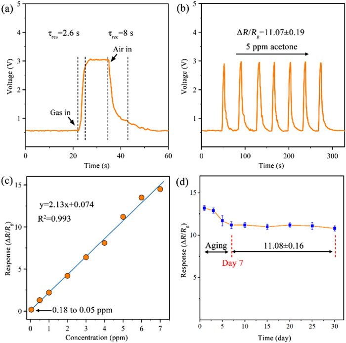 After screening the basic gas sensing properties, the FZO-6 based MEMS sensor was selected to accept full gas sensing tests. Fast response is crucial for the warning system to save lives in some special workplaces, such as factory floor, production line and mine [29,30]. The response voltage vs. time curve of FZO-6 sensor is shown in Fig. 4a. The response time (τres = 2.6 s) and the recovery time (τrec = 8 s) proved the fast response and recovery performance, which is swift enough for the practical application. The stability properties decide whether the industrial potential of gas sensors. Reproducibility is also vital criterion for assessing the performance of gas sensors, which marks the credibility of the data [31]. As shown in Fig. 4b, seven repeated testing cycles under 5 ppm acetone vapor indicate essentially identical baselines and sensing response values (ΔR/Rg = 11.07±0.19). The relationship between acetone vapor concentration and response value of gas sensor is displayed in Fig. 4c. The transformed data give a plot that relationship between the response value 'y' and the concentration of acetone vapor 'x' can be conveyed as y = 2.13x + 0.074 with great linearity (R2 = 0.993), and the detection limit was 0.05 ppm acetone with response value 0.18.
