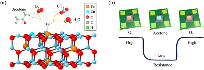 The crystal structure of Fe-ZnO and the sensing reaction process are shown in Fig. 5a. Its typical sensing reaction includes three steps [33]. Firstly, O2 molecules adsorbed on the surface could extract electrons from conduction band to form chemisorbed oxygen ions (Eq. 5). After exposure to acetone molecules, the ionized oxygen would react with adsorbed acetone (Eq. 6). Finally, the products of the reaction desorbed from the surface of sensing materials.