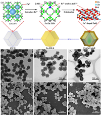 | Fig. 1. (a) Diagrammatical illustration of complex shell Fe-ZnO synthesis routine. (b) TEM and (c) SEM images of pure ZIF-8. (d) TEM and (e) SEM images of pristine ZIF-8 heated at 400 ℃ in air for 2 h. (f) TEM and (g) SEM images of 6%-Fe-ZIF-8 heated at 400 ℃ in air for 2 h. | |
