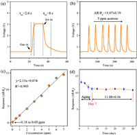 | Fig. 4. (a) Response curve to 5 ppm acetone vapor, (b) Cyclic stability tests of FZO-6 to 5 ppm acetone vapor, (c) The relationship between acetone vapor concentration and response value of FZO-6 gas sensor, and (d) Long-term stability tests of FZO-6 to 5 ppm acetone vapor (T = 210 ℃, RH = 30%). | |