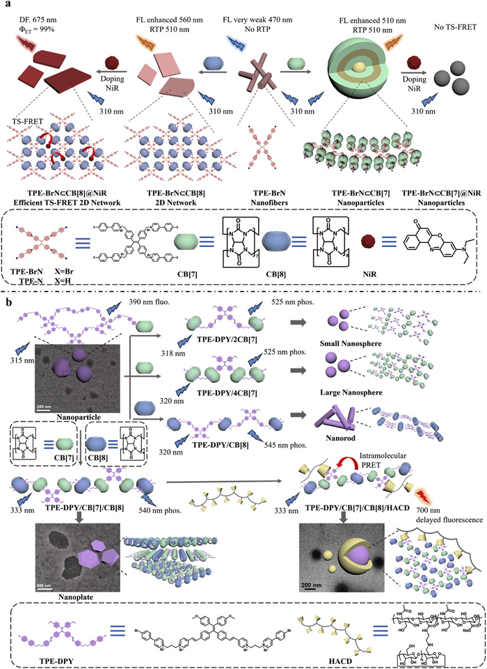 On the basis of previous work, recently, Professor Yu Liu's group combined the bromo-phenylpyridinium phosphorescence molecule with TPE, and bromo-phenylpyridinium non-conjugatedly on the four-arms TPE (TPE-BrN) form nanofibers with 470 nm weak fluorescence emission (Fig. 1a) [4]. Through the 1:2 inclusion between cucurbit[8]uril (CB[8]) and bromo-phenylpyridinium, two-dimensional network structure with high fluorescence-phosphorescence dual emission at 560 nm and 510 nm was induced. The phosphorescence resonance energy transfer (PRET) of the assembly TPE-BrN/CB[8] with a long-lived NIR emission (675 nm) was given after doping with the organic dye NR (energy transfer efficiency is as high as 99%). Subsequently, in order to red-shift the long-lived luminescence, they non-conjugatedly modified bromo-phenylpyridine on the divinyl-pyridine-derived TPE (TPE-DPY), as shown in Fig. 1b [5]. Interestingly, different topologies were present through different binding modes of cucurbituril (CB[7–8]) and guest molecules, accompanied by different phosphorescence emissions which showed from fluorescent nanoparticles (TPE-DPY, 390 nm), phosphorescent nanorods (TPE-DPY@CB[8], 545 nm), phosphorescent large nanospheres (TPE-DPY@4CB[7], 525 nm), to phosphorescent small nanospheres (TPE-DPY@2CB[7], 525 nm), and then to phosphorescent nanosheets (TPE-DPY@CB[7]@CB[8], 540 nm). More importantly, the TPE-DPY@CB[7]@CB[8] was further assembled with β-cyclodextrin modified hyaluronic acid (HACD) to surprisingly achieve intramolecular PRET, from 540 nm of the phenylpyridine unit to 700 nm of the methoxy-tetraphenylethylene functional group, which was successfully applied to targeted imaging of cancer cell mitochondrion.