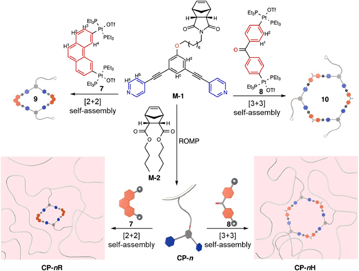 Very recently, Shijun Li, Peter Stang, Feihe Huang, Jianying Huang and co-workers reported highly robust SPNs crosslinked by a tiny amount of metallacycles based on metal-coordination interactions [5]. As depicted in Fig. 1, a norbornene monomer (M-1) featuring a 120° dipyridine group was synthesized. The self-assembly of M-1 with the 60° Pt(Ⅱ)-based acceptor 7 in a 1:1 molar ratio yielded a [2 + 2] Pt(Ⅱ)-coordinated rhomboid (9), whereas the self-assembly of M-1 with the 120° Pt(Ⅱ)-based acceptor 8 resulted in a [3 + 3] hexagonal metallacycle (10). These metallacycles underwent characterization through 31P{1H} and 1H NMR spectroscopy, electrospray ionization mass spectrometry (ESI-MS), and single crystal X-ray analysis. Copolymerization of M-1 with a diester-derived norbornene monomer, M-2, yielded covalent copolymers (CPs) with feed ratios of M-1/M-2 = 1:60 for CP-1, 1:180 for CP-2, 1:360 for CP-3, and 1:600 for CP-4, respectively. Subsequently, coordination-driven self-assemblies of CPs were conducted by mixing the CPs with 7 and 8, respectively, in THF to generate the corresponding metallacycle-crosslinked polymer networks (MCPNs). Due to the robust crosslinking of metallacycles, MCPNs derived from CP-1 (containing 1.64 mol% dipyridine units) and CP-2 (0.55 mol%) rapidly transformed into gels, while MCPNs (CP-3R, CP-3H, CP-4R, and CP-4H) originating from CP-3 (0.28 mol%) and CP-4 (0.17 mol%) remained soluble but exhibited substantially elevated viscosities.