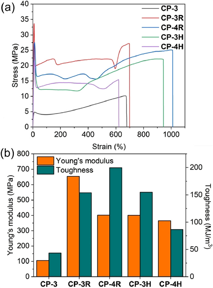 | Fig. 2. (a) Stress‒strain curves of CP-3 and MCPNs recorded with a deformation rate of 100 mm/min. (b) Young's moduli and toughness of CP-3 and MCPNs calculated from their stress‒strain curves. Reproduced with permission [5]. Copyright 2024, Nature Publishing Group. | |