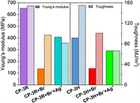 | Fig. 3. Young's moduli and toughness of CP-3R, CP-3R + Brˉ, CP-3R + Brˉ + Ag+, CP-3H, CP-3H + Brˉ, and CP-3H + Brˉ + Ag+. Reproduced with permission [5]. Copyright 2024, Nature Publishing Group. | |