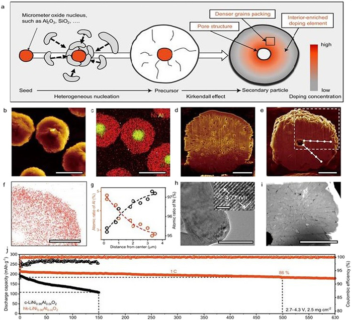 Li's group recently has proposed the combined strategy of heterogeneous nucleation and Kirkendall effect for optimizing the stress-strain state and uniform distribute stress within particles to improve the stability of NRLO materials effectively [5]. As shown in Fig. 1a, heterogeneous nucleation is carried out on the introduced exotic metal/metalloid oxide seeds during the co-precipitation process, followed by solid-state Kirkendall effect during high-temperature annealing process. During the annealing process, the diffusion coefficient of Al atoms is much greater than that of Ni. The annealing process promotes the diffusion of Al atoms towards the outer layer, leading to the formation of voids in the center of secondary particles and the formation of an Al-rich internal doping structure. Through scanning electron microscopy (SEM) and energy dispersive spectrometer (EDS) observations (Figs. 1b and c), the core-shell precursor particles are composed of Al element mainly in the core and Ni element mainly in the outer shell. Notably, there are significant differences in the cross-sectional morphology of the material after annealing. The structure of c-LiNi0.96Al0.04O2 particles with many small cavities inside prepared by conventional methods is relatively loose (Fig. 1d), which can easily evolve into cracks while there are no obvious small cavities and only a micro-sized central void for the internal structure of hk-LiNi0.96Al0.04O2 is formed (Fig. 1e).