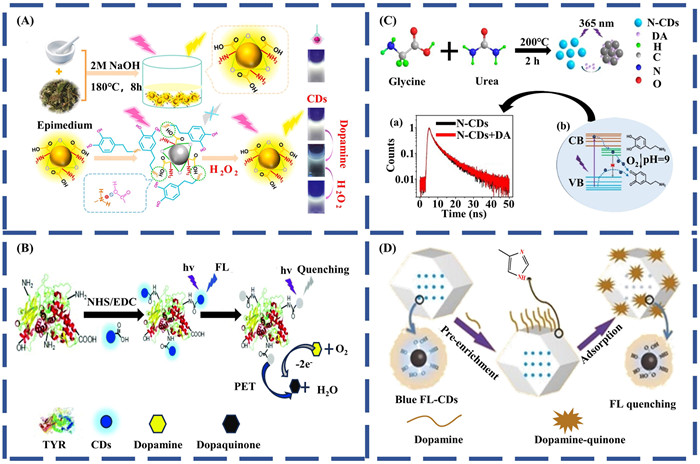 2. Carbon dots-based dopamine sensors 2.1. Fluorescent sensorsFluorescence sensors offer advantages, such as operational simplicity, rapid detection, and high sensitivity [44-48], the fluorescent sensors demonstrate swift and precise measurements of dopamine at various concentrations [49,50], indicating elevated sensitivity and reproducibility. Notably, these sensors can detect dopamine at nanomolar levels, with a broad spectral range that minimizes interference from potential biomolecules [51]. Within the realm of fluorescent sensors, interaction with dopamine induces a change in fluorescence intensity, forming the basis for detection. CDs, which are renowned for their exceptional photostability, luminescence, and wide spectral absorption, have been incorporated into dopamine fluorescent sensors. In a study by Zhang et al. [52], CDs with yellow fluorescence were successfully synthesized from Epimedium using a green synthesis method. The dopamine detection mechanism involved quenching the CDs’ fluorescence through electrostatic interaction with dopamine, resulting in an excellent sensor with a wide linear range of 0.1–1000 µmol/L and a low limit of detection (LOD) of 0.087 µmol/L. The subsequent addition of hydrogen peroxide gradually restored fluorescence by disrupting electrostatic interactions (Fig. 1A). In a parallel effort, Lan et al. employed a hydrothermal method to synthesize CDs with a fluorescence quantum yield (QY) of 49% using 1,3,6-trinitropyrene and Na2SO3 as raw materials. These CDs served as fluorescent probes for the detection of iron ions and dopamine [53].