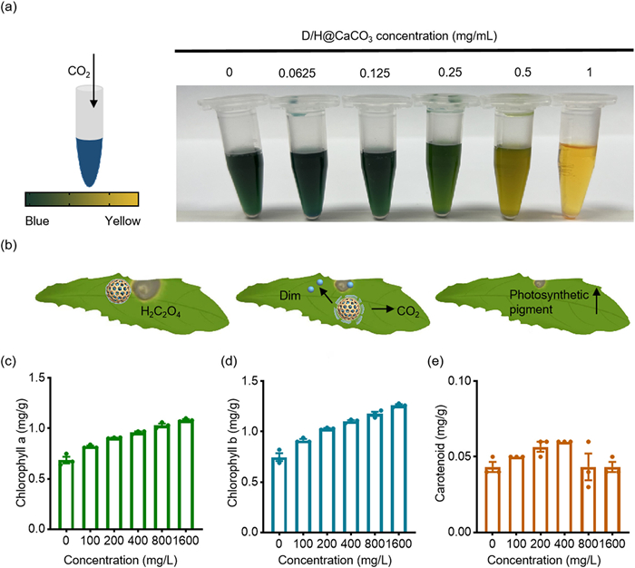 | Fig. 2. (a) Color changes in bromothymol blue indicator after treatment with CO2 generated by different concentrations D/H@CaCO3. (b) Schematic illustration of D/H@CaCO3 promoting plant photosynthesis. CaCO3 coated on D/H@CaCO3 degrading and generating CO2 in the acidic microenvironment of S. sclerotiorum, which could be beneficial for plant photosynthesis and plant growth. (c) Chlorophyll a, (d) chlorophyll b, and (e) carotenoids levels in the leaves treated with different concentrations of D/H@CaCO3. Data are presented as means ± SEM (n = 3). | |