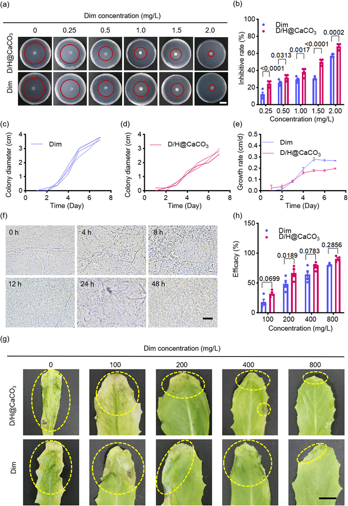 | Fig. 3. (a) Photos of S. Sclerotiorum colony on the 7th day after administration of Dim or D/H@CaCO3. A red circle represents the fungal colony (scale bar: 2 cm). (b) The quantitative analysis of inhibition rate of Dim or D/H@CaCO3 against S. sclerotiorum. (c, d) The colony diameter was measured at 0, 1, 2, 3, 4, 5, 6 and 7 days after treatment with Dim or D/H@CaCO3 at an effective Dim concentration of 1.5 mg/L. (e) The growth rate of Dim and D/H@CaCO3 against S. sclerotiorum at an effective Dim concentration of 1.5 mg/L. (f) Microscopic images of hyphae at 0, 4, 8, 12, 24 and 48 h after D/H@CaCO3 treatment. Scale bar: 50 µm. (g) Photos of S. sclerotiorum-infested romaine leaves on the 7th day after being treated with different concentrations of D/H@CaCO3 or Dim. Scale bar: 1 cm. (h) Control efficacy of Dim and D/H@CaCO3 in controlling Sclerotinia disease. Data in (b) and (h) are compared by one-way ANOVA. *P < 0.05, **P < 0.01, ***P < 0.001. Data are presented as means ± SEM (n = 4). | |