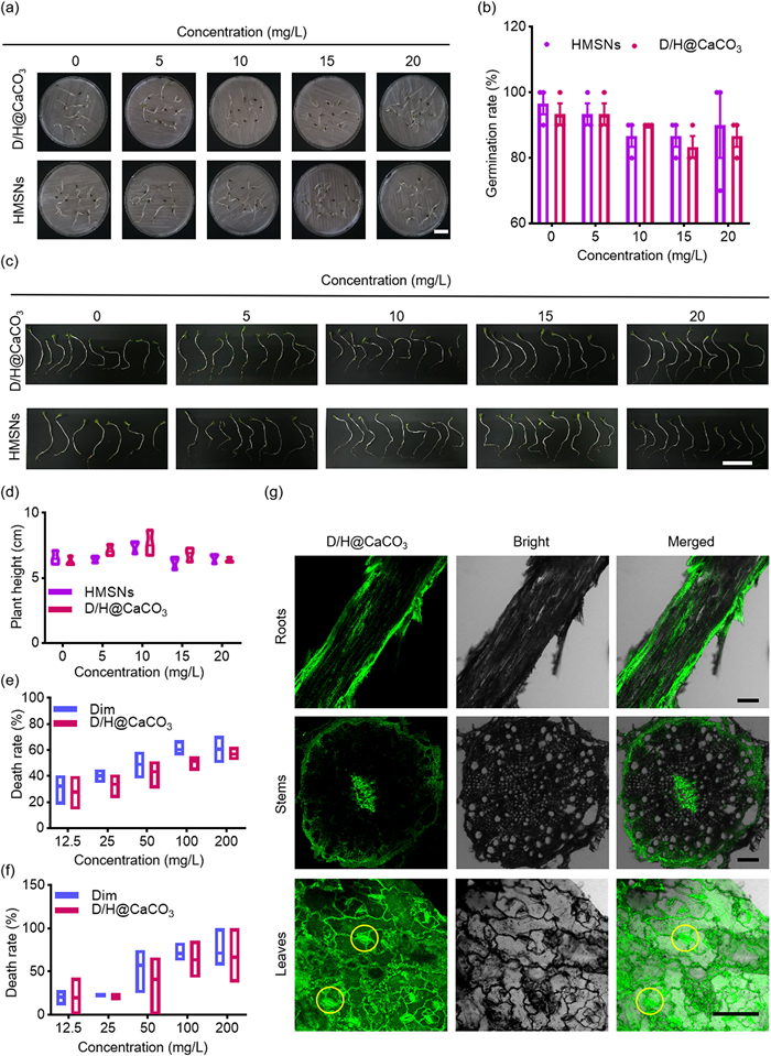 | Fig. 4. (a) Photographs (scale bar: 20 mm) and (b) germination rate of seeds after 5 days of treatment with HMSNs or D/H@CaCO3 at different concentrations. (c) Photographs (scale bar: 5 cm) and (d) plant height after 12 days of treatment with HMSNs or D/H@CaCO3 at different concentrations. The death rate of (e) earthworms and (f) zebrafish after 48 h of treatment with Dim or D/H@CaCO3. (g) Confocal images of romaine roots, stems, and leaves after being treated with FITC-stained D/H@CaCO3. Green fluorescence represents FITC-stained D/H@CaCO3. Scale bar: 100 µm. Data are presented as means ± SEM (n = 3). | |