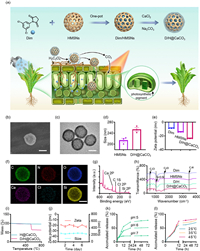 | Fig. 1. (a) Schematic illustration for preparing D/H@CaCO3 and the mechanism of enhanced S. sclerotiorum inhibition and plant photosynthesis. The preparation procedure of D/H@CaCO3. D/H@CaCO3 responds to the acidic microenvironment of S. sclerotiorum to release Dim and CO2. This enhances the inhibitory effect of Dim on S. sclerotiorum, and the CO2 generated by CaCO3 further promotes photosynthesis in romaine lettuces. (b) SEM and (c) TEM of D/H@CaCO3. Scale bar: 100 nm. (d) Hydrodynamic diameters of HMSNs and D/H@CaCO3. (e) Zeta potentials of Dim, HMSNs, and D/H@CaCO3. (f) EDS mapping of D/H@CaCO3. Scale bar: 100 nm. (g) XPS image of D/H@CaCO3. (h) FTIR spectra of Dim, HMSNs, D/H and D/H@CaCO3. (i) TGA curves of H@CaCO3 and D/H@CaCO3. (j) Zeta potential and hydrodynamic diameters changes of D/H@CaCO3 at 0 ℃ for 7 days. (k) Release behavior of D/H@CaCO3 at pH 5, 6, and 7 (35 ℃) and (l) temperatures at 25, 35, 45 ℃ (pH 5). Data are presented as means ± SEM (n = 3). | |