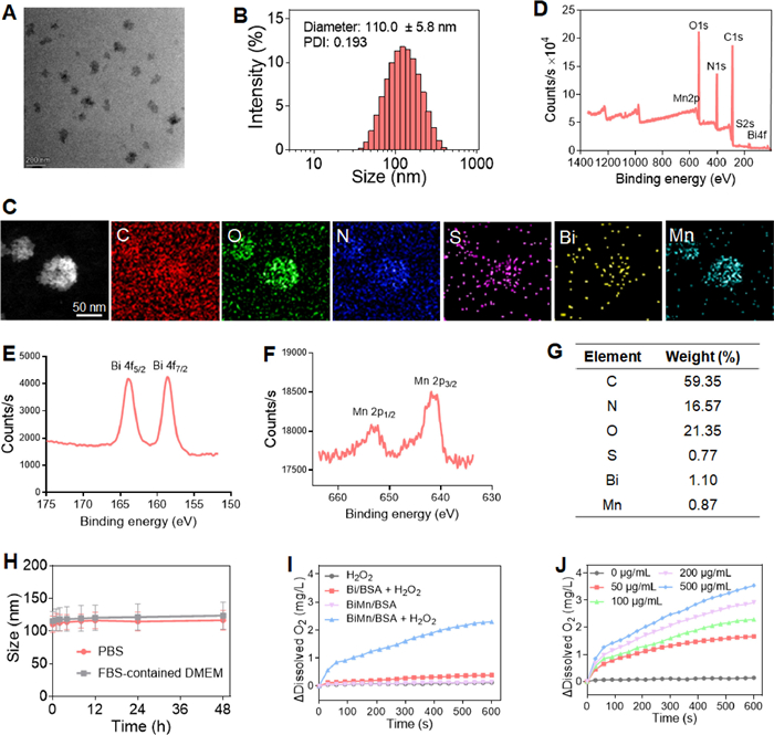 | Fig. 1. (A) TEM image. Scale bar: 200 nm. (B) hydrodynamic size and (C) element mapping of BiMn/BSA. (D) XPS spectra showed the survey spectrum. (E) Bi 4f and (F) Mn 2p orbitals of BiMn/BSA. (G) The element content of BiMn/BSA was measured by ICP-OES. (H) Dynamic monitoring the particle size of BiMn/BSA in PBS and FBS-contained DMEM. Oxygen generation in H2O2 solutions after adding (I) various formulations and (J) different concentrations of BiMn/BSA. Quantitative results are presented as standard deviation (SD) (n = 3). Differences among multiple groups were assessed using one-way ANOVA. | |