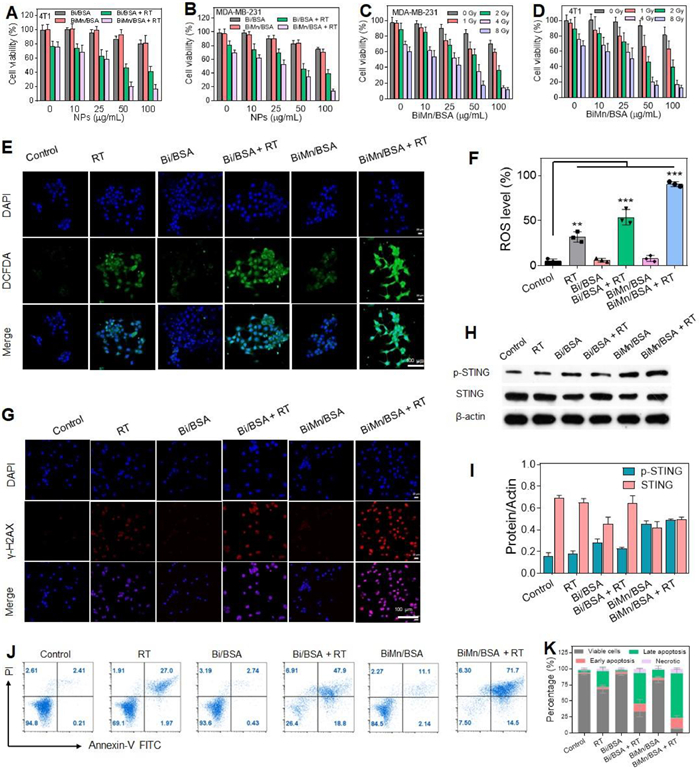 | Fig. 2. The viability of (A) 4T1 cells and (B) MDA-MB-231 cells after different treatments. The viability of (C) 4T1 cells and (D) MDA-MB-231 cells exposed to different doses of X-ray radiation with different concentrations of BiMn/BSA (n = 5). (E) Confocal fluorescence images probing the ROS. Scale bar: 100 µm. (F) Flow cytometry analysis the intracellular ROS levels in 4T1 cells after various treatments. (G) Confocal fluorescence images of γ-H2AX after various treatments. Scale bar: 100 µm. (H) The expression levels of STING and p-STING proteins evaluated by Western blot and (I) quantified analysis after various treatments. (J) Flow cytometry analysis of the death of 4T1 cells with different treatments and (K) corresponding rate of viable, early apoptosis, late apoptosis and necrotic cells (n = 3). Quantitative results are presented as mean ± SD. Differences among multiple groups were assessed using one-way ANOVA. **P < 0.01, ***P < 0.001. | |