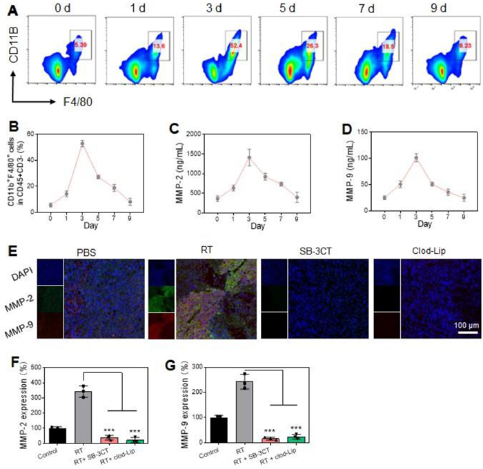 | Fig. 3. (A) Flow cytometry to determine the abundance of F4/80+CD11b+ TAMs in 4T1 tumors at various timepoints following 4 Gy RT treatment, and (B) the quantification of macrophages in the tumor microenvironment. ELISA analysis the levels of (C) MMP-2 and (D) MMP-9 in corresponding tumor tissues. (E) Immunofluorescence staining showing the MMP-2 and MMP-9 in tumors with different treatments. Quantitative analysis of Western blot detection for (F) MMP-2 and (G) MMP-9 in tumor tissues with different treatments. Quantitative results are presented as mean ± SD (n = 3). Differences among multiple groups were assessed using one-way ANOVA. ***P < 0.001. | |