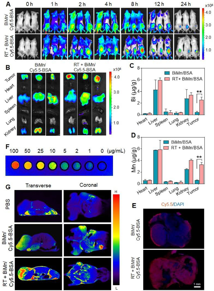 Having confirmed the ECM-regulation effect of RT, we next aimed to employ such mechanism to deliver nanoparticles. As indicated by the above results, nanoparticles with Cy5.5 labeling were administrated on day 3 post-RT. Upon vein injection, the fluorescence was eventually seen throughout the mice body in 1 h, indicating broad biodistribution of the nanoparticles. The nanoparticles were gradually eliminated with decreased fluorescence, while selective accumulation into tumor was seen at 12 h and 24 h, owing the EPR effect (Fig. 4A). Notably, it seems that mice with RT showed an obviously stronger fluorescence at tumor than that of non-RT group. To confirm this, major organs and tumor tissues were extracted at 24 h for ex vivo imaging, and we indeed observed a much brighter signal for RT + BiMn/BSA group (Fig. 4B). For more accurate quantification, Bi and Mn level was measured by inductively coupled plasma (ICP), which was 6.1-fold and 5.4-fold higher for RT group (Figs. 4C and D). Therefore, more BiMn/BSA were delivered into tumor when combining with a low-dose RT. Actually, such effect has been demonstrated in our previous work, which was also attributed to RT-induced macrophages infiltration [28]. The tumor infiltrated macrophages not only serve as nanoparticles drug depots, but also elicit bursts of extravasation to enhance drug uptake into tumor, both of which could enhance drug uptake into tumor. It is essential to note that all animal experiments in this study were conducted in strict adherence to ethical guidelines for animal use and care at Central South University. Approval for these experiments was granted by the local Institutional Ethics Review Committee.