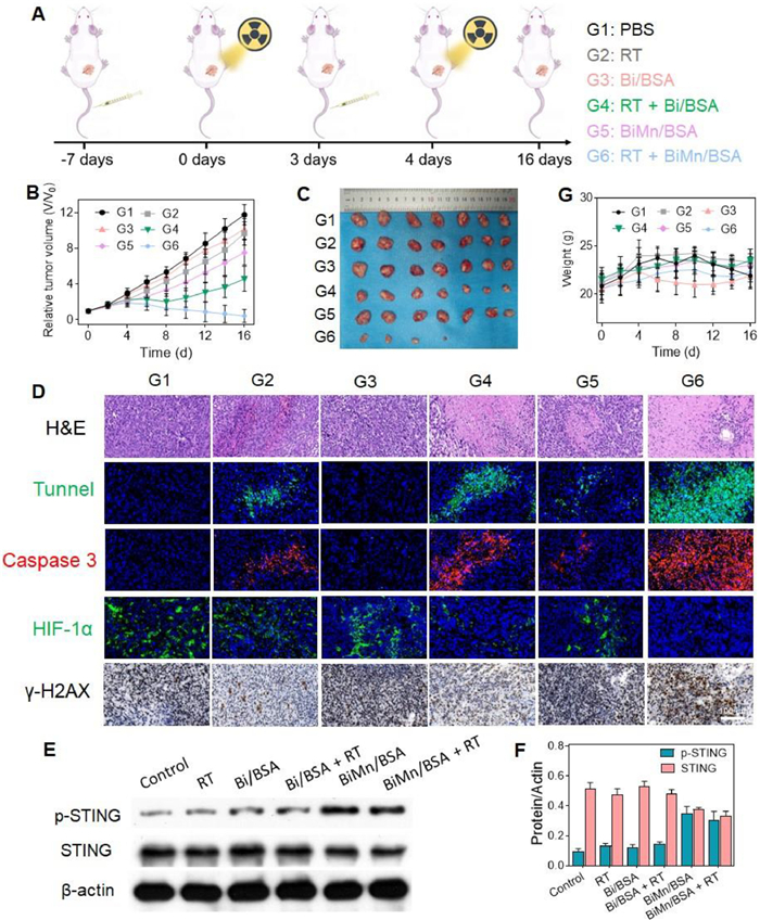 | Fig. 5. (A) Overall treatment schedule of in vivo anti-tumor experiment (n = 7). (B) Changes of tumor volume during various treatments. (C) Photographs of tumors harvested after different treatments. (D) H&E, terminal deoxynucleotidyl transferase dUTP nick end labeling (TUNEL), caspase 3, HIF-1α, and γ-H2AX staining to evaluate necrosis, apoptosis, tumor hypoxia, and nuclear damage of tumor after various treatments. Scale bar: 100 µm. (E) The level of STING and p-STING proteins after treatments, and (F) a quantitative analysis. In each panel, G1, PBS; G2, RT; G3, Bi/BSA; G4, RT + Bi/BSA; G5, BiMn/BSA; G6, RT + BiMn/BSA (n = 3). Quantitative results are presented as mean ± SD. Differences among multiple groups were assessed using one-way ANOVA. | |