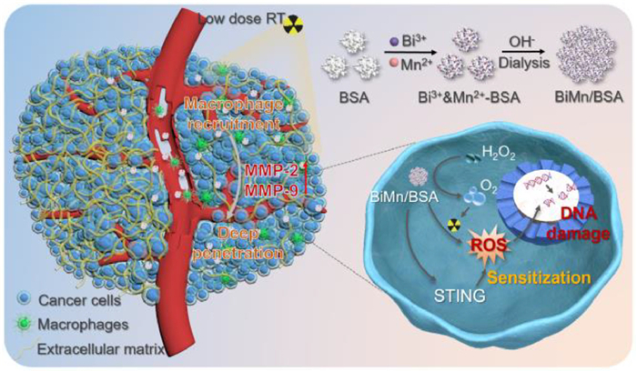 In conclusion, we have developed BiMn/BSA nanoparticles as a novel nanoradiosensitizer with multiple mechanisms to enhance radiotherapy efficacy. By incorporating Bi/Mn through biomineralization, these nanoparticles exhibit excellent radiosensitizing properties. Furthermore, we have discovered a previously unexplored phenomenon where low-dose radiotherapy induces the recruitment of macrophages to the tumor site, which significantly improves the accumulation and deep penetration of nanoparticles within the tumor. Our findings highlight the crucial role of macrophages in modulating the tumor microenvironment by upregulating metalloproteinases, thereby promoting the degradation of the extracellular matrix and facilitating the penetration of nanoparticles into the tumor core. In vivo studies have demonstrated the remarkable potential of combining low-dose radiotherapy with BiMn/BSA nanoparticles, resulting in enhanced radiotherapy efficacy and complete tumor eradication. Importantly, this therapeutic approach maintains full biocompatibility, ensuring its safe application in clinical settings. Our research sheds light on the effectiveness of metal-based nanoradiosensitizers and the significance of macrophage-mediated tumor accumulation in overcoming the limitations of conventional radiotherapy. By leveraging these approaches, we can improve the delivery of therapeutic agents to tumors and enhance their deep penetration into the tumor microenvironment. This study opens new avenues for improving nanoparticle radiotherapy sensitization, holding great promise for enhancing treatment outcomes in cancer patients.