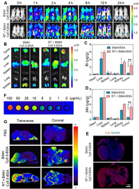 | Fig. 4. (A) In vivo images showing the dynamic biodistribution of BiMn/Cy 5.5-BSA post nanoparticles injection and (B) ex vivo imaging of fluorescence in tumors and main organs at 24 h post administration. (C) Bi and (D) Mn contents in main organs and tumors at 24 h post-injection of BiMn/Cy 5.5-BSA measured by ICP-MS. (E) Penetration and distribution of BiMn/BSA into tumor at 24 h post injection. Scale bar: 1 mm. (F) T1-weighted contrast-enhanced MRI images of different concentrations of BiMn/BSA into PCR tubes. (G) Mouse tumor MRI T1 images of tumors after different treatment. Quantitative results are presented as mean ± SD (n = 3). Differences among multiple groups were assessed using one-way ANOVA. **P < 0.01. | |