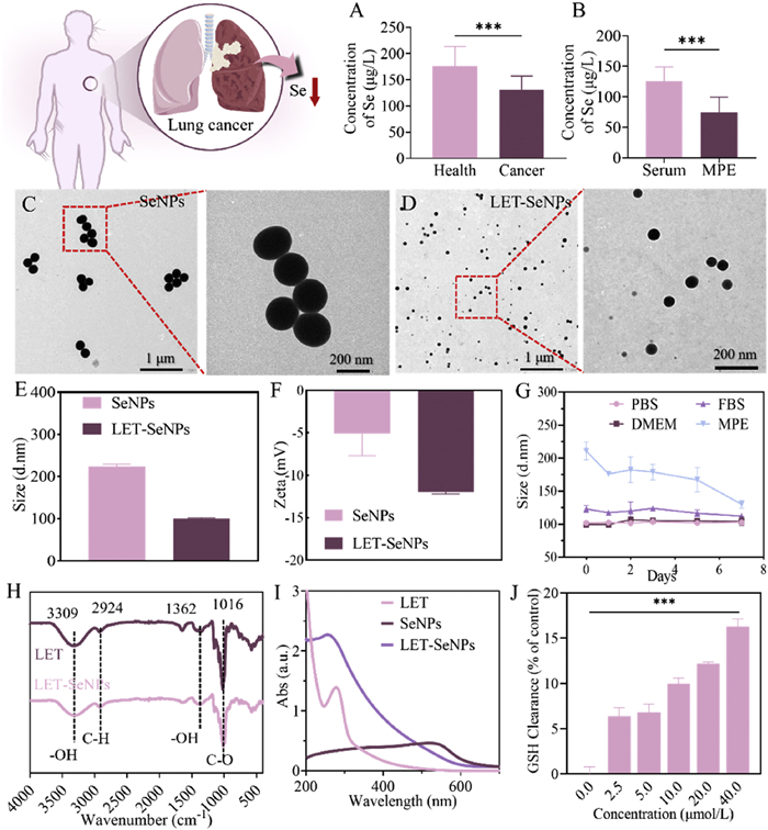 | Fig. 1. Se concentrations and characterizations of SeNPs. (A) Serum Se concentrations in healthy controls and lung cancer patients. (B) Se concentrations in serum and MPE of the lung cancer patients. (C, D) TEM images of SeNPs and LET-SeNPs. (E) Particle sizes of SeNPs and LET-SeNPs. (F) Zeta potentials of SeNPs and LET-SeNPs. (G) Particle size variation trend of LET-SeNPs over 7 days. (H) FT-IR analysis of LET and LET-SeNPs. (I) UV–vis analysis of LET, SeNPs and LET-SeNPs. (J) GSH clearance of different LET-SeNPs concentrations. *** P < 0.001. The same below. | |