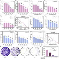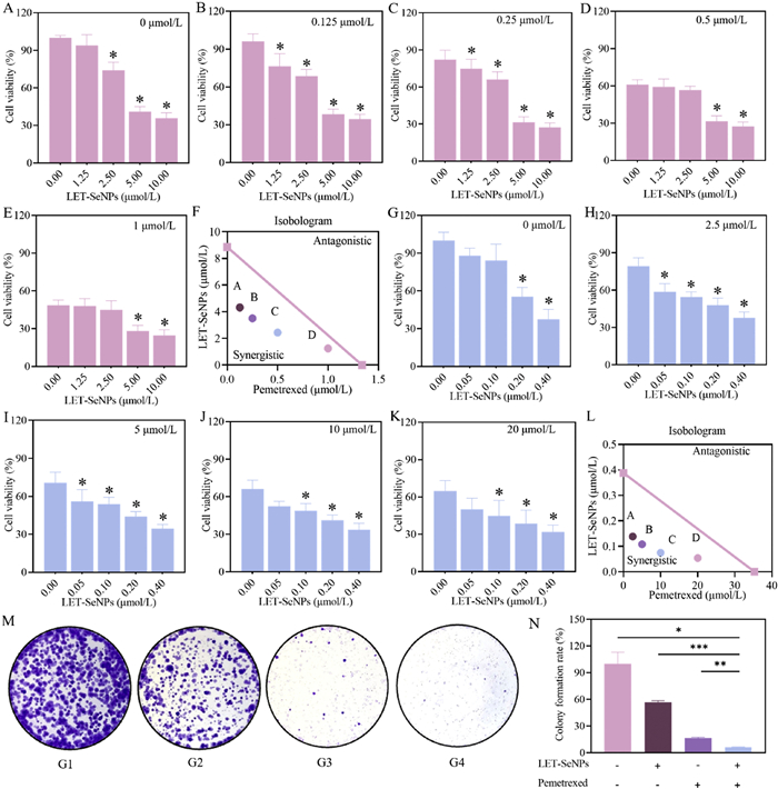 | Fig. 2. Effects of LET-SeNPs combined with pemetrexed on lung cancer cell viability. (A-E) The effects of LET-SeNPs (0, 1.25, 2.5, 5, and 10 µmol/L) combined with different pemetrexed concentrations (0, 0.125, 0.25, 0.5, and 1 µmol/L) on A549 cells' viability. *: compared to 0 µmol/L of LET-SeNPs, P < 0.05. The same below. (F) Isobologram analysis of the combined effects on A549 cells. The points A-D in the isobologram correspond to the 50% growth inhibition rate in combined treatment. The same below. (G-K) The effects of LET-SeNPs (0, 0.05, 0.1, 0.2, and 0.4 µmol/L) combined with different pemetrexed concentrations (0, 2.5, 5, 10, and 20 µmol/L) on H1299 cells' viability. (L) Isobologram analysis of combined effects on H1299 cells. (M, N) Clonogenic assay of combined effects on A549 cells. G1: Control; G2: LET-SeNPs (5 µmol/L); G3: pemetrexed (0.25 µmol/L); G4: LET-SeNPs (5 µmol/L) combined with pemetrexed (0.25 µmol/L). * P < 0.05; ** P < 0.01. The same below. | |