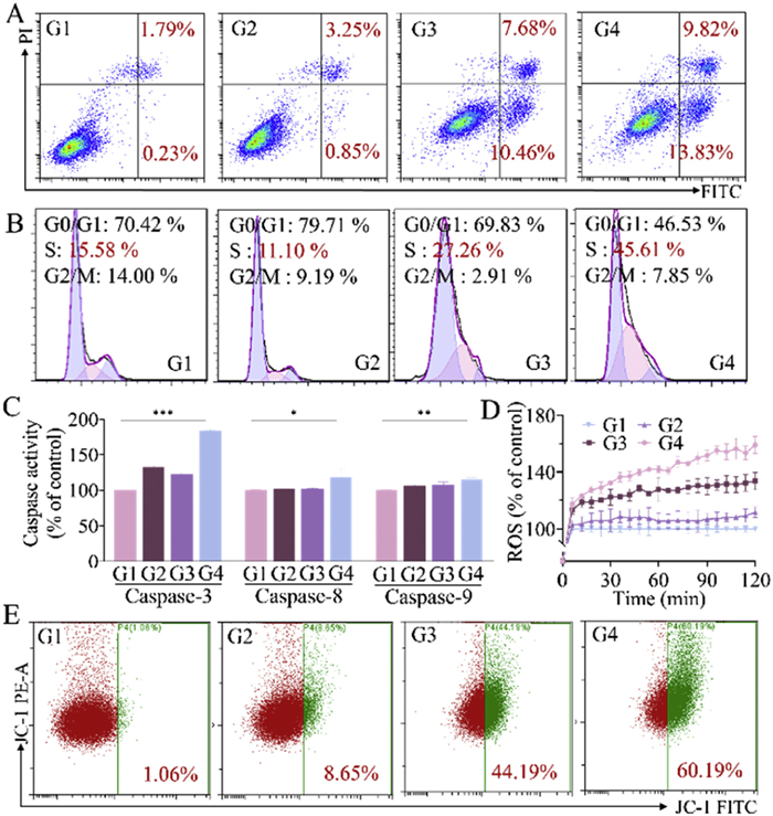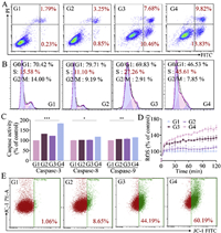 | Fig. 3. Effects of LET-SeNPs combined with pemetrexed on cell apoptosis, cell cycle, Caspases activity, ROS level and mitochondrial function in A549 cells. (A) The apoptosis rate of A549 cells in different groups. G1: Control; G2: LET-SeNPs (10 µmol/L); G3: pemetrexed (0.5 µmol/L); G4: LET-SeNPs (10 µmol/L) combined with pemetrexed (0.5 µmol/L). The same below. (B) Cell cycle distribution analysis of A549 cells in different groups. (C) Effects of co-treatment on Caspases-3, Caspases-8, and Caspases-9 activity. (D) The variation trends of ROS in different groups for 2 h. (E) Percentages of monomeric JC-1 in different groups. | |