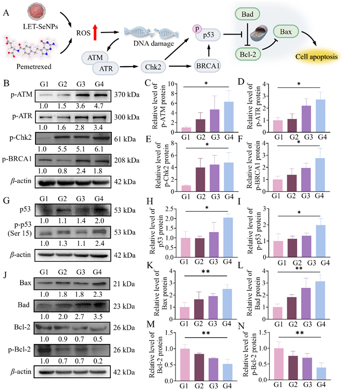 | Fig. 4. Effects of LET-SeNPs combined with pemetrexed on protein expression in A549 cells. (A) The schema of LET-SeNPs combined with pemetrexed influencing protein expression. (B-F) Representative images and quantification of Western blot analysis of p-ATM, p-ATR, p-Chk2 and p-BRCA1 protein expression. G1: Control; G2: LET-SeNPs (10 µmol/L); G3: pemetrexed (0.5 µmol/L); G4: LET-SeNPs (10 µmol/L) combined with pemetrexed (0.5 µmol/L). (G-I) Representative images and quantification of Western blot analysis of p53 and p-p53 protein expression. (J-N) Representative images and quantification of Western blot analysis of Bax, Bad, Bcl-2 and p-Bcl-2 protein expression. | |