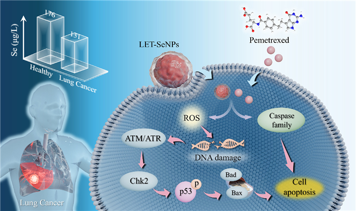 In summary, based on the investigation results of Se deficiency in lung cancer patients, LET-SeNPs might be used as a potential Se supplement. In this study, LET-SeNPs showed adequate dispersion and stability and were innovatively employed as chemosensitizers for pemetrexed. MTT and colony formation experiments demonstrated that LET-SeNPs could enhance the cytotoxicity of pemetrexed and decrease lung cancer cell proliferation. Further, LET-SeNPs combined with pemetrexed generated a large amount of ROS in lung cancer cells, which in turn, might reduce mitochondrial membrane potential and induce apoptosis of the cancer cell. Additionally, LET-SeNPs promoted the cell cycle arrest induced by pemetrexed. This study demonstrated the synergistic therapeutic effects of LET-SeNPs on pemetrexed in cancer treatment and provided new insights and strategies for NSCLC chemotherapy.