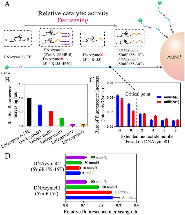 | Fig. 1. (A) The comprehensive effect on the cleaving activity of 5′ extended DNAzyme variants based on structural transformation and interfacial factor. (B) The relative fluorescence increasing rate of DNAzyme variants with different 5′ extension structures. (C) The relationship between the relative fluorescence increasing rate and the extended nucleotide number of DNAzyme variants with or without miRNA-155 (miR155) addition. The critical point was also shown. (D) The relative fluorescence increasing rate produced by DNAzyme01 and DNAzyme02 after adding 0, 10, 50, and 100 nmol/L miR155. Error bars: mean ± standard deviation (SD) (n = 3). | |