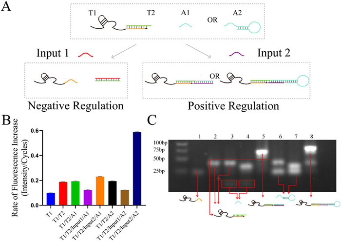| Fig. 3. (A) Schematic illustration of structural regulatory strategy and the effect of different inputs and bulky strands. (B) The rate of fluorescence increase for different complexes of DNAzyme and other strands. (C) Gel electrophoresis of the complex with different inputs. Lane 1: T1. Lane 2: T1/T2. Lane 3: T1/T2/A1. Lane 4: T1/T2/Input1/A1. Lane 5: T1/T2/Input2/A1. Lane 6: T1/T2/A2. Lane 7: T1/T2/Input1/A2. Lane 8: T1/T2/Input2/A2. Error bars: mean ± SD (n = 3). | |