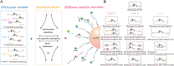 | Scheme 1. (A) The schematic diagram of the synergistic effect of the DNAzyme nonfunctional structural changes and interfacial factors on DNAzyme activity. (B) The series of 8-17E DNAzyme variants with versatile recognition arm extension structures. | |