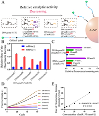 | Fig. 2. (A) The comprehensive effect on the cleaving activity of 3′ extended DNAzymes based on structural transformation and interfacial factor. (B) The relative fluorescence increasing rate of DNAzyme variants with different 3′ extension structures. (C) The relative fluorescence increasing rate produced by DNAzyme 07 and DNAzyme08 after adding 0, 10, 50, and 100 nmol/L miR155. (D) The fluorescence response produced by DNAzyme 07 after adding miR155 on DS-AuNPs. (E) The relationship between the concentration of added miR155 and the rate of fluorescence increase. Error bars: mean ± SD (n = 3). | |