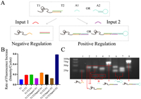 Multiple modulation functions involving positive and negative regulation were developed based on the regulatory principles of DNAzyme variants on DS-AuNPs (Fig. 3A). 8-17E DNAzyme variant T1 was designed with 3′-end extension of nonfunctional sequences, which are complementary to an ssDNA T2. T1/T2 complex with the assistant strand (A1 or A2) in the reaction system could be positively or negatively regulated with different inputs (Input1 or Input2). With the addition of Input1, T2 and Input1 formed a stable dsDNA through a toehold-mediated strand displacement. Compared to the original T1/T2 complex, the newly exposed T1 exhibited stronger nonspecific adsorption to DS-AuNPs, resulting in a negative regulatory effect (Fig. 3B). When Input2 is introduced, T1/T2 and assistant strand could form T1/T2/Input2/A1 or T1/T2/Input2/A2 complex with strand hybridization. In these complexes, nonspecific adsorption is blocked better than T1/T2, and the steric hindrance at the 3′-end affects the orientation of T1 to be more accessible to the substrate. Thus, Input2 showed a positive regulation effect (Fig. 3B). Both the A1 and A2 positively influenced the catalytic activity of the DNAzyme variant on DS-AuNPs. Notably, the stem-loop structure in A2 provided stronger steric hindrance and exhibited a more obvious regulatory effect (lane 8 in Fig. 3B) compared to A1 (lane 5 in Fig. 3B). Gel electrophoresis (Fig. 3C) verified the formation of the complex with different inputs so that different signals were produced. The bidirectional moderating effects of interface factors could also be used in biological logic circuits. Desirable outputs could be obtained for different inputs by simply regulating the interface factors, which may be further used to realize complicated biological networks.