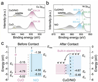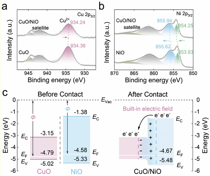 | Fig. 2. (a) Cu 2p3/2 XPS spectra of CuO and CuO/NiO. (b) Ni 2p3/2 XPS spectra of NiO and CuO/NiO. (c) Band structures of CuO and NiO before contact (left) and energy band diagram of CuO/NiO (right). | |