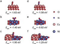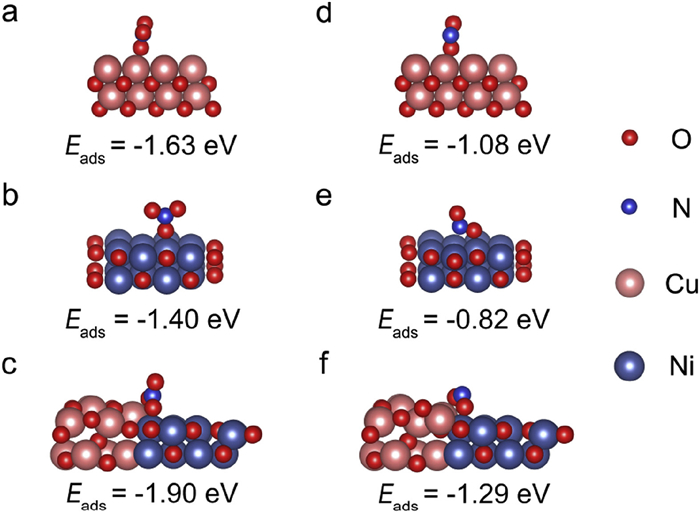 | Fig. 4. Calculated adsorption energies of NO3− and NO2− on (a, d) CuO, (b, e) NiO, and (c, f) CuO/NiO. | |