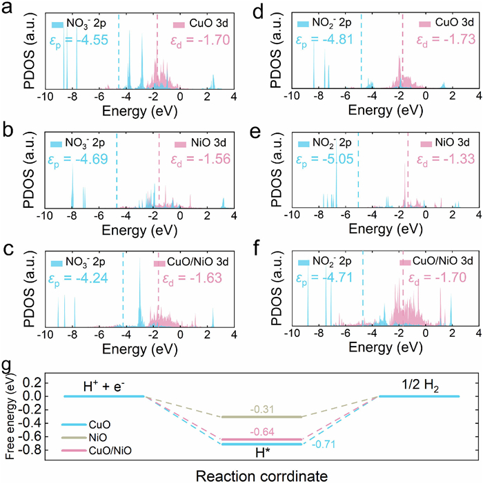 | Fig. 5. PDOS of (a, d) CuO, (b, e) NiO, and (c, f) CuO/NiO with NO3− and NO2− adsorption. (g) Calculated Gibbs free energies for HER on CuO/NiO and pure CuO and NiO. | |
