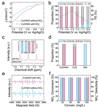 | Fig. 3. (a) LSV curves of CuO/NiO in 0.05 mol/L Na2SO4 with and without 100 mg/L NO3−. (b) Product distribution of electrocatalytic NO3− reduction by CuO/NiO at different potentials. (c) 1H NMR spectra of the electrolyte (0.05 mol/L Na2SO4 with and without 100 mg/L NO3−) after the electrocatalytic NRA reaction. Inset of (c): the quantitative comparison of the NH4+ yield rates and FEs achieved by CuO/NiO based on the NMR and UV–vis spectrophotometric methods. (d) Comparison of product distribution of electrocatalytic NO3− reduction by CuO/NiO, CuO, and NiO. (e) Dimethyl-1-pyrroline-N-oxide spin-trapping ESR spectra of H* stemmed from CuO/NiO in the absence and presence of NO3−. (f) Effect of initial NO3− concentration on NO3− conversion and NH4+ selectivity of CuO/NiO. | |