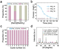 | Fig. 6. (a) Effect of the molar ratio of NaCl and Na2SO4 on NO3− conversion (the total molar concentration of NaCl and Na2SO4 was 0.05 mol/L). (b) Time-dependent changes in the concentrations of NO3−-N, NO2−-N, and NH4+-N of CuO/NiO in the molar ratios of NaCl and Na2SO4 of 4:1. (c) Product distribution of electrocatalytic NO3− reduction by CuO/NiO in cycle tests (each test lasting 180 min). (d) XRD pattern of CuO/NiO after cycle 1 test. | |