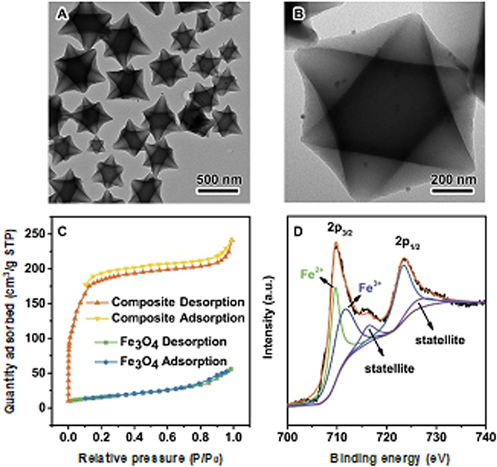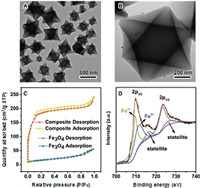 | Fig. 1. (A, B) Transmission electron microscopy (TEM) images of the magnetic MIL-101 sorbents, and their corresponding (C) N2 adsorption isotherms and (D) X-ray photoelectron spectroscopy (XPS) spectrum of Fe 2p. | |