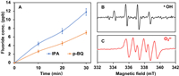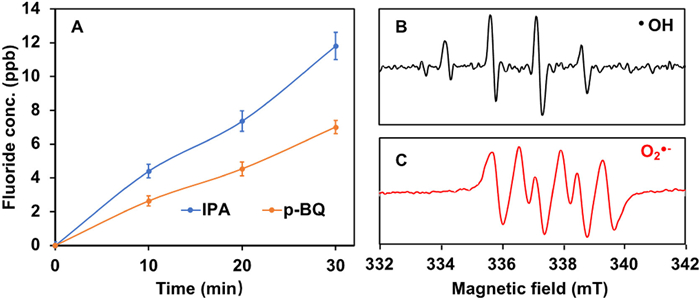 | Fig. 4. (A) Fluoride liberation in the presence of different scavengers. EPR spectra of (B) •OH and (C) O2•− in the system. | |