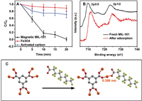 | Fig. 2. (A) Adsorption kinetics of three adsorbents used in this study. (B) Fe 2p XPS spectra of fresh magnetic MIL-101 and the one after PFOA adsorption. (C) Proposed adsorption mechanism through the complexation between Fe and -COO−. | |