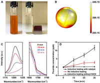 | Fig. 3. (A) Magnetic separation of PFOA adsorbed MIL-101 from synthetic groundwater, the separation time was around 15 min. (B) Temperature gradient near a Fe3O4 nanoparticle (Unit of temperature: K, inductive heating source: 300 W and 60 Hz). (C) Time-dependent FTIR spectra of the asymmetric stretching band for -CF2 (left, located at ~1207 cm−1) and for -COO− (right, located at ~1712 cm−1) of the MIL-101 during the inductive heating Fenton reactions and (D) fluoride liberation during the process. | |