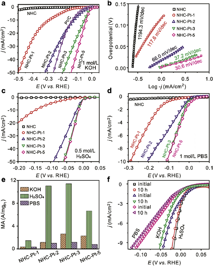 | Fig. 3. Electrocatalytic performances of the catalysts for HER. (a) The linear sweep voltammetry (LSV) curves of Pt/C, NHC, NHC-Pt-1, NHC-Pt-2, NHC-Pt-3 and NHC-Pt-5 samples tested in 1 mol/L KOH. (b) The corresponding Tafel plots. LSV curves of different samples in (c) 0.5 mol/L H2SO4 and (d) 1 mol/L PBS solution. (e) Mass activities of NHC-Pt at overpotential of 0.05 V in KOH, H2SO4 and PBS solution. (f) The LSV curves of the NHC-Pt-3 sample before and after chronoamperometry test in 1 mol/L KOH, 1 mol/L PBS and 0.5 mol/L H2SO4 solution. | |
