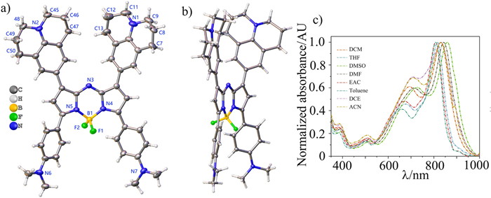 | Fig. 2. Oak ridge thermal ellipsoid plot (ORTEP) views of QLD-BDP (CCDC: 2299513) (displacement ellipsoids at the 30% probability level). (a) Front, (b) side views of the molecular structure. Selected bond lengths (Å) and angles (°): N4-B1, 1.547(6); N5-B1: 1.546(6); B1-F1: 1.375(6); B1-F2: 1.425(6); N4-B1-N5: 106.2(4); F1-B1-F2: 110.1(4). (c) Normalized absorption of QLD-BDP in different solvents, respectively. | |