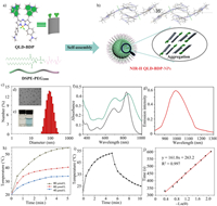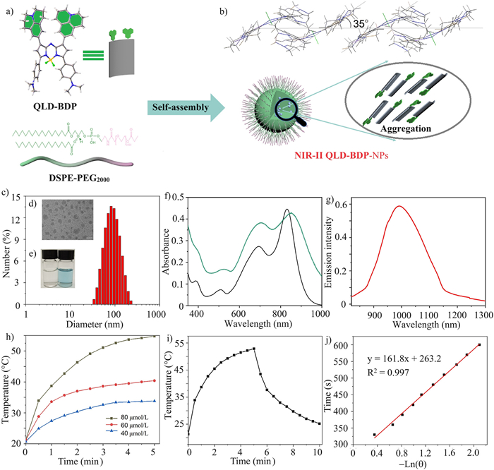 | Fig. 3. (a) Self-assembly of QLD-BDP-NPs. (b) Molecular packing diagram of side view for QLD-BDP. (c) DLS of QLD-BDP-NPs in aqueous solution. (d) TEM of QLD-BDP-NPs in aqueous solution. Scale bar: 100 nm. (e) Photo of pure water and QLD-BDP-NPs in water. (f) Absorption of 2 µmol/L QLD-BDP-NPs (black curve) in CH2Cl2 and 10 µmol/L QLD-BDP-NPs in water (green curve). (g) Fluorescence of 10 µmol/L QLD-BDP-NPs in water. λex = 808 nm; laser source. (h) Temperature changes of QLD-BDP-NPs at different concentrations (40–80 µmol/L) under 808 nm laser irradiation (0.8 W/cm2). (i) Temperature response curves of QLD-BDP-NPs in aqueous solutions under irradiation and naturally cooling. (j) Linear fitting of –Lnθ and time. | |
