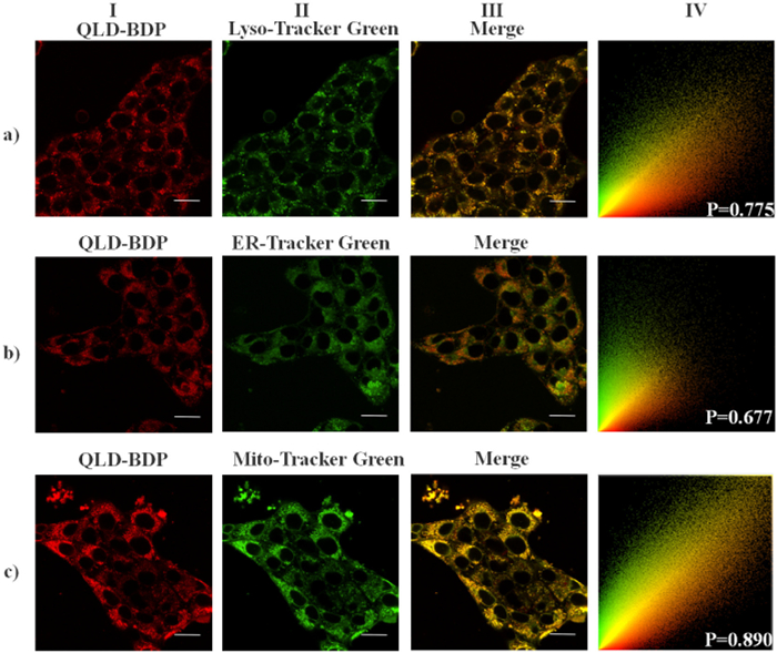| Fig. 4. Colocalization of QLD-BDP-NPs with LTG, ETG or MTG for (a) lysosome, (b) endoplasmic reticulum, and (c) mitochondria in 4T1 cells (QLD-BDP-NPs: λex =640 nm, λem = 650–750 nm; Tracker: λex = 488 nm, λem = 500–600 nm; Scale bar: 20 µm). Cells were labeled with QLD-BDP-NPs (20 µg/mL) and LTG (1.0 µmol/L), ETG (1.0 µmol/L) or MTG (1.0 µmol/L), respectively. (Ⅰ) QLD-BDP-NPs labeled with red fluorescence; (Ⅱ) Organelles labeled with green fluorescence; (Ⅲ) Superposition of red and green fluorescence in yellow, indicating colocalization; (Ⅳ) Pearson coefficient of pixel intensity. | |