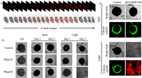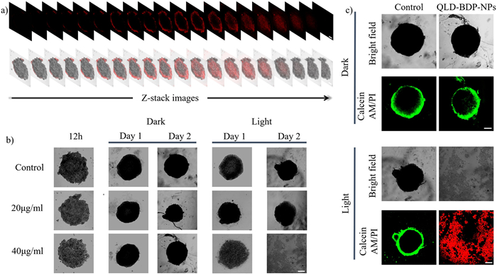 | Fig. 5. (a) Imaging of MCSs of 4T1 cells (λex =640 nm, λem = 650–750 nm). (b) CLSM analysis image of 4T1 MCSs. MCSs were cultured in a medium PBS containing 20 or 40 µg/mL QLD-BDP-NPs. Use a laser at 850 nm (0.3 W/cm2, 900 s) for light irradiation. The images of the spherical formation for 12 h before irradiation were recorded, and the images of the first and second days with or without light irradiation were recorded. (c) Live/dead cell imaging of 4T1 MCS treated with QLD-BDP-NPs under dark and light irradiation (850 nm, 0.3 W/cm2, 900 s), respectively. Scale bar: 200 µm. | |