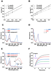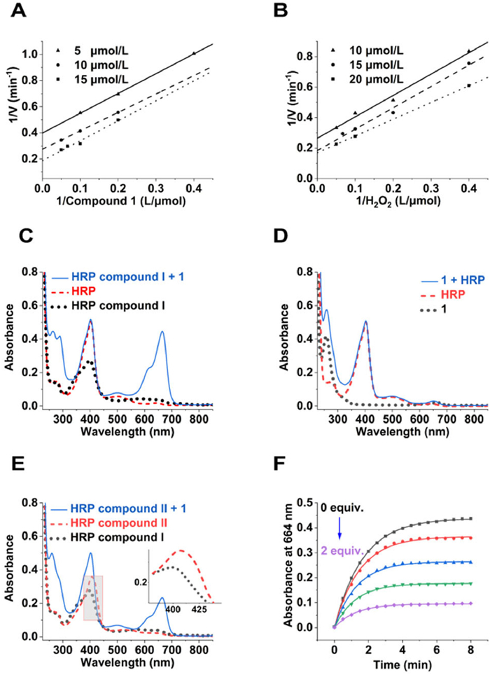 | Fig. 2. Mechanism study of the reaction between HRP, H2O2, and compound 1. (A, B) Double-reciprocal plots of activity of HRP at a fixed concentration of one substrate versus varying concentration of the second substrate for H2O2 and compound 1. (C) The absorbance spectrum of HRP, HRP compound I, HRP compound I + compound 1 (1 equiv.). (D) The absorbance spectrum of compound 1, HRP, HRP + compound 1 (1 equiv.). (E) The absorbance spectrum of HRP compound I, HRP compound II (generated by self-decomposition of HRP compound I), HRP compound II + compound 1 (1 equiv.). (F) Cleavage of urea bond in compound 1 (5 µmol/L) by HRP/H2O2 (1 nmol/L + 10 µmol/L) in the presence of different dose of radical scavenger ascorbic acid (from 0 to 2 equiv. with an interval of 0.5 equiv.). | |