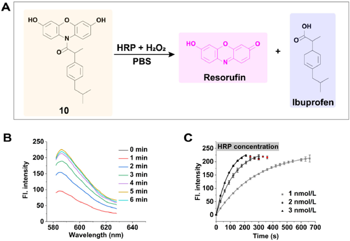 | Fig. 3. Cleavage of amide bond within compound 10 by HRP in the presence of H2O2. (A) Scheme illustration of decompostration of compound 10 by HRP/H2O2. (B) Fluorescence spectrum of 5 µmol/L compound 10 after coincubation with HRP/H2O2 (2 nmol/L, 10 µmol/L) for different times. (C) Fluorescence intensity change of compound 10 (5 µmol/L) at 585 nm in the presence of different amounts of HRP and a fixed amount of H2O2 (10 µmol/L). The red dots represent resorufin being oxidized to non-fluorescent resazurin. Mean ± SD, n = 3. | |