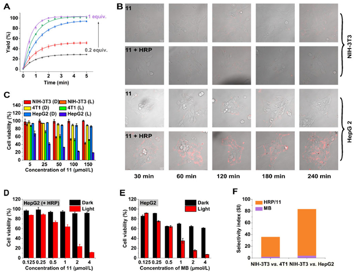 In all tested cell lines, compound 11 showed excellent biosafety neither in the dark nor under irradiation (Fig. 4C). In the presence of HRP, compound 11 recovered its phototoxicity toward HepG2 cells (1.27 µmol/L) with close IC50 to free MB (0.70 µmol/L) (Fig. 4D). Similar result was observed in 4T1 cells (3.01 µmol/L vs. 1.19 µmol/L) (Fig. S41 in Supporting information). However, this enzyme/prodrug pair demonstrated much less phototoxicity toward normal NIH-3T3 cells compared to free MB (99.71 µmol/L vs. 3.09 µmol/L) (Fig. S42 in Supporting information). To evaluate the targeted effect of this enzyme/prodrug approach, the selectivity index (SI) was calculated by dividing the IC50 toward normal cell by IC50 toward the tumor cell. The SI was elevated significantly from 2.59 to 33.13 (NIH-3T3 vs. 4T1), and from 4.41 to 78.51 (NIH-3T3 vs. HepG2) separately (Fig. 4F). Both are much higher than the threshold of a selective drug (typical value = 10). Generally, this indicated that the cooperative-activated strategy showed much more specificity than free MB (~12-fold and 17-fold) and operate efficiently in living mammalian cells.