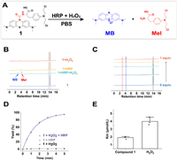 | Fig. 1. Cleavage of urea bond within compound 1 by HRP in the presence of H2O2. (A) Scheme illustration of decomposition of compound 1 by HRP/H2O2. (B) HPLC analysis of compound 1 with different treatments. Blue line: control. Green line: 5 nmol/L HRP, 50 µmol/L H2O2, 10 min. Yellow line: 5 nmol/L HRP, 3 h. Orange line: 50 µmol/L H2O2, 3 h. (C) HPLC analysis of compound 1 treated by different dose H2O2 with fixed HRP concentration. (D) Dynamic analysis of the cleavage reaction calculated by MB release rate. (E) Km for compound 1 and H2O2 calculated by Michaelis-Menten plots. Mean ± standard deviation (SD), n = 3. | |