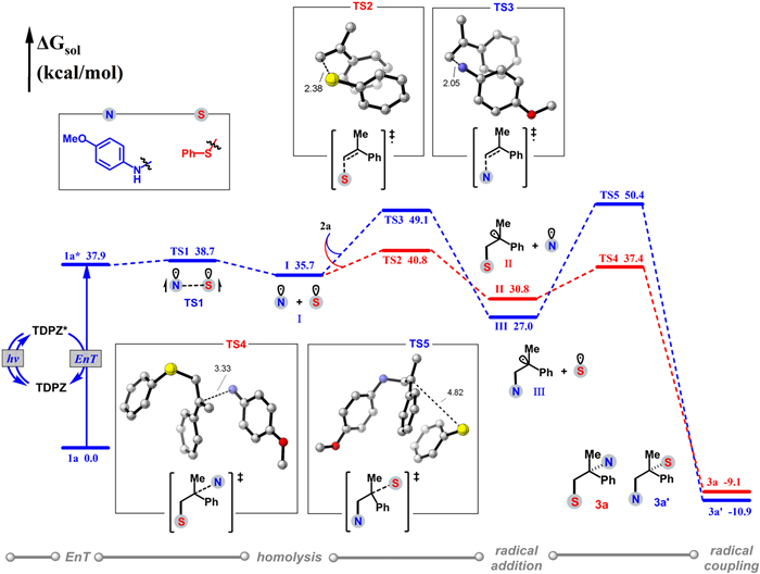 To further substantiate the proposed reaction pathways and elucidate the precise regioselectivity (Scheme 5g), density functional theory (DFT) calculations were then performed. As depicted in Fig. 1, the mechanism of the reaction can be reasonably postulated to commence with a triplet-triplet EnT event between triplet excited state of photosensitizer TDPZ and the singlet state of sulfenamide reagent 1a. Subsequently, a homolysis cleavage of the triplet excited state 1a* occurs via TS1 (0.8 kcal/mol), leading to the generation of S-radical and N-radical [44]. The ensuing step involves the active S-radical undergoing addition to the terminal carbon of styrene 2a via TS2, affording an addition intermediate II with a free energy barrier of 5.1 kcal/mol. In contrast, a parallel radical addition involving the N-radical and styrene 2a via TS3 necessitates surmounting a notably higher free energy barrier of 13.4 kcal/mol. Ultimately, a radical-radical cross coupling event between intermediate II and the N-radical via TS4 gave the final product 3a with a free energy barrier of 6.6 kcal/mol. On the other hand, another analogous radical coupling between intermediate III and the S-radical via TS5 necessitates overcoming a significantly higher free energy barrier of 19.6 kcal/mol. Considering the substantial disparity in free energy between TS2 and TS3, as well as between TS4 and TS5, it is apparent that the formation of the product 3a is kinetically favored. This rationalization effectively accounts for the remarkable regioselectivity that has been observed in this difunctional transformation.